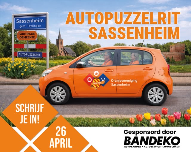 De Autopuzzelrit maakt eindelijk zijn comeback in Sassem! Op zondag 26 april ben je welkom vanaf 12.00 uur bij v.v. Ter Leede Sassenheim voor een gezellige middag vol puzzelen, rijden en plezier. Of je nu fanatiek meedoet of gewoon zin hebt in een leuk uitje met vrienden, familie of buren: deze rit is voor iedereen! Onderweg kom je verrassende opdrachten tegen en na afloop ben je welkom in de kantine voor een drankje en de uitleg van de rit.