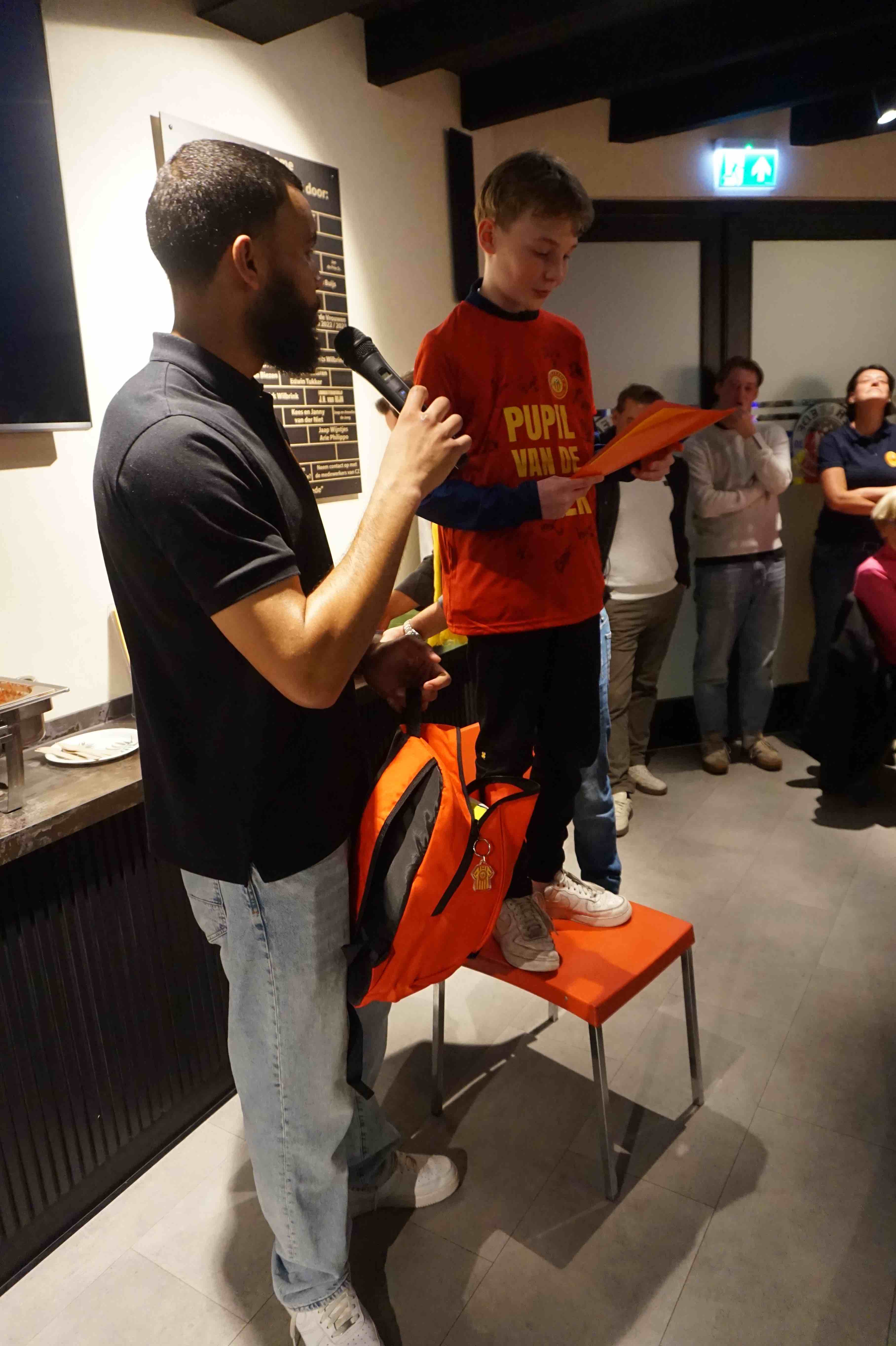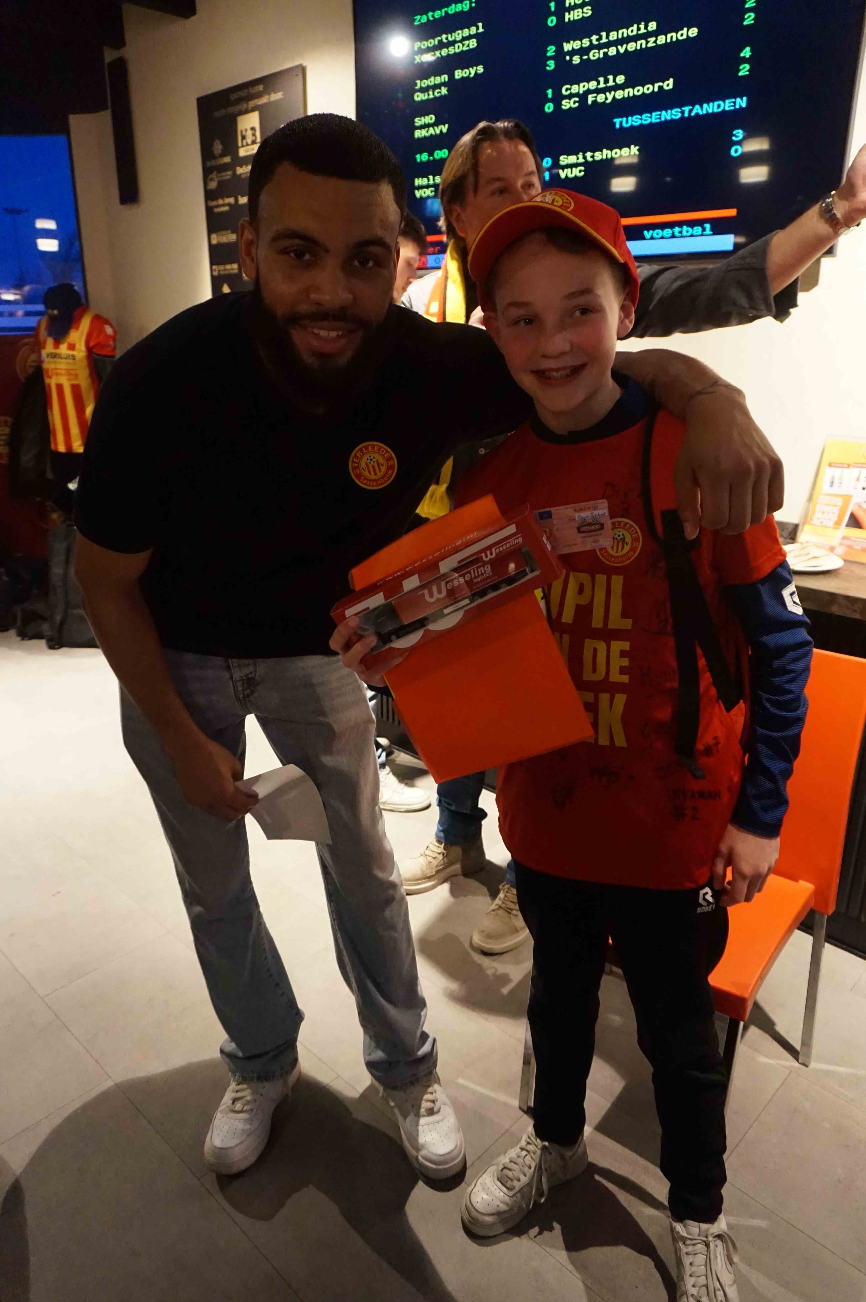 Hier mochten we wat eten en drinken en hier werd ik naar voren geroepen samen met de Man of the Match, Ferris Inyamah. Peter deed een leuk praatje en ik kreeg allemaal leuke Ter Leede spullen.